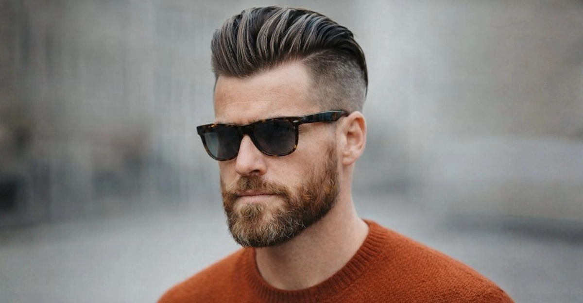 The modern pompadour fade is a highly structured and polished cut that rewards meticulous daily styling with an undeniably attractive payoff. The hair flows upward and back from the front, often paired with a deep side part that adds definition. A sleek texture with careful coloring creates extra depth, while a wide-tooth comb helps maintain control. A full beard gives the look balance, and the sharp fade provides stark contrast for greater visual appeal.